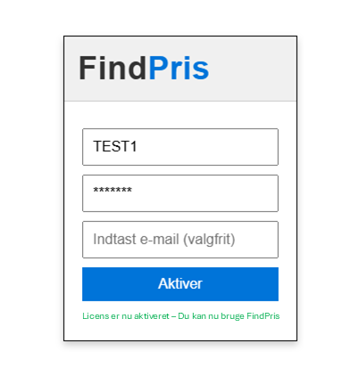 Når du klikker på FindPris-knappen første gang, vil et vindue poppe op, hvor du skal indtaste din licensnøgle og firmanavn.